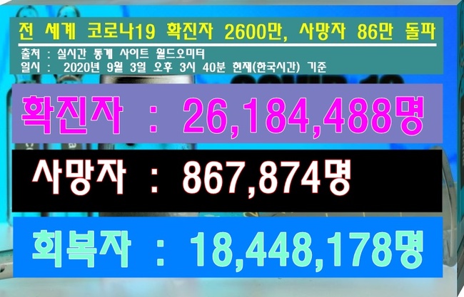 그래픽 : 내외경제신문 전 세계 코로나19 감염 확진자 수가 2600만 명을 돌파한 26,184,488명, 사망자의 수도 85만 명을 웃도는 867,374명으로 집계되고 있다.(실시간 통계 사이트 월드오미터, 2020년 9월 3일 오후 3시 40분 현재, 한국시간 기준)