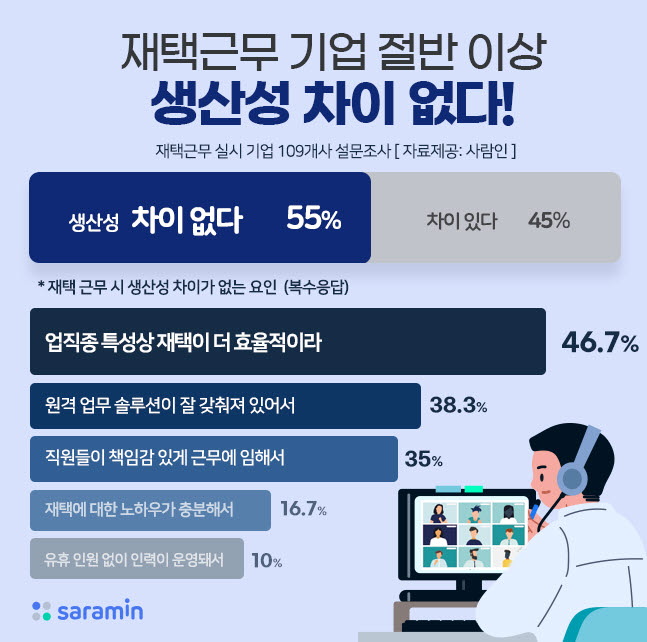 사람인이 ‘재택근무 생산성 현황’을 조사한 결과, 재택근무를 실시하는 기업의 55%가 ‘생산성의 차이가 없다’고 밝혔다. (자료=사람인 제공)재택 근무를 실시하는 기업 절반 이상이 재택근무와 사업장 출근 근무 시 생산성의 차이를 못 느낀다고 답한 조사 결과가 나왔다.