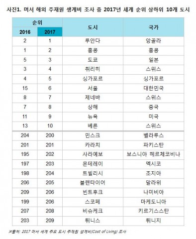 ▲ 머서 해외 주재원 생계비 조사 중 2017년 세계 순위 상하위 10개 도시세계적인 컨설팅 기업 머서(MERCER)가 실시한 ‘해외 주재원 생계비 조사’ 결과 앙골라의 루완다가 1위로 선정되었다. 이어 홍콩이 2위, 도쿄가 3위, 취리히가 4위, 싱가포르가 5위에 올랐다.