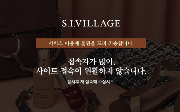 면세품 시중 판매에 접속자가 몰려 사이트가 마비된 에스아이빌리지. (사진=에스아이빌리지)새로고침을 누르면 사이트와 어플리케이션(앱)은 한참 구동을 멈췄다가 '접속자가 많아 사이트 접속이 원활하지 않다'는 문구만 표출된 채 처음 화면으로 돌아가지 않았다.