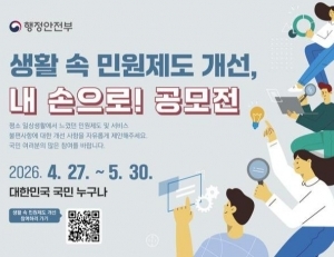 행정안전부는 27일부터 5월 30일까지 국민이 일상에서 느끼는 민원 불편을 직접 제안해 정책에 반영하는 ‘2026 생활 속 민원제도 개선, 내 손으로’ 공모를 실시한다고 밝혔다. 민원제도 개선 제안 공모 안내 (행정안전부)국민이 체감하는 행정서비스 개선을 위해 정부가 민원제도 공모에 나선다. 이번 공모는 행정기관 중심의 시각